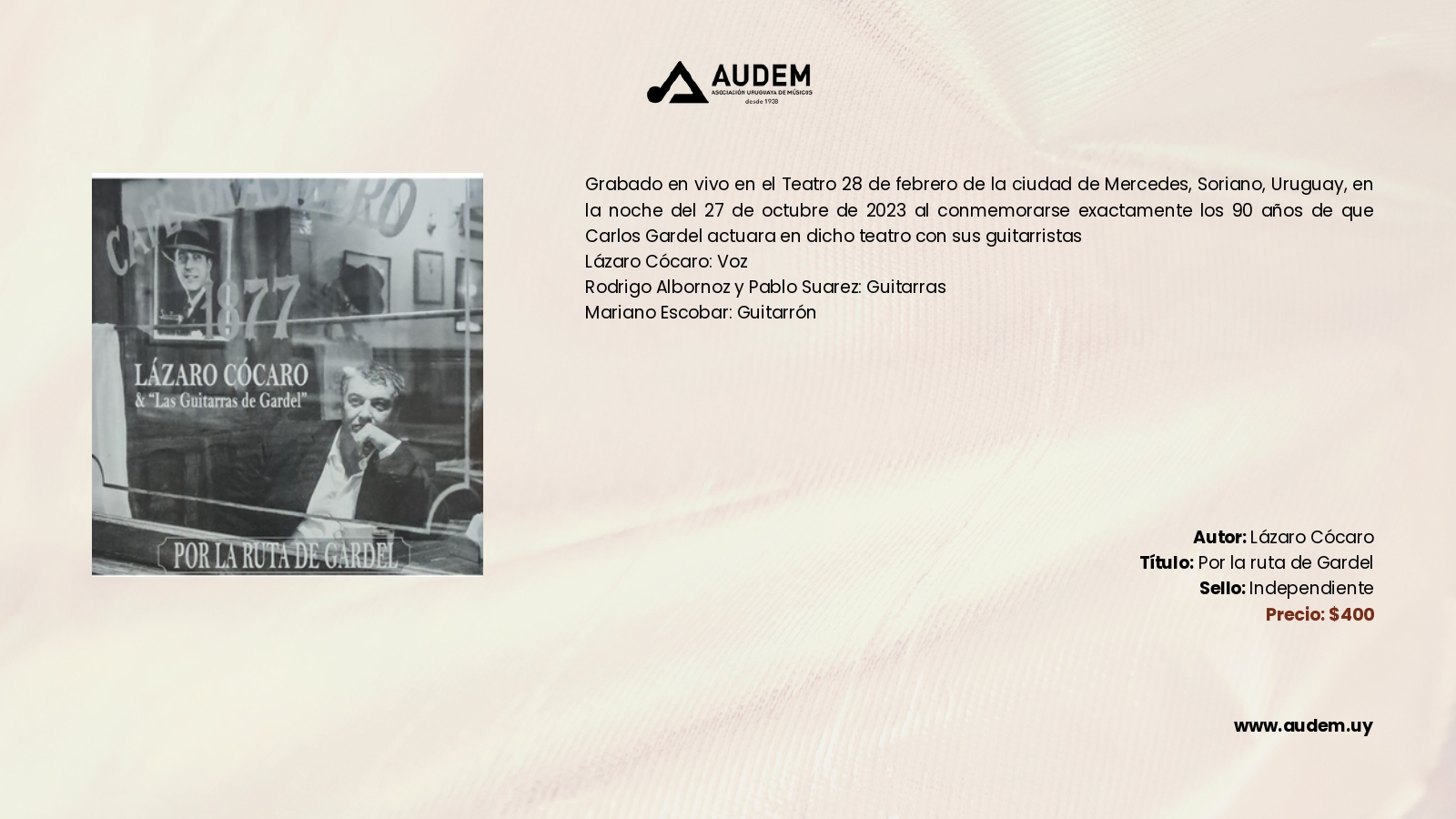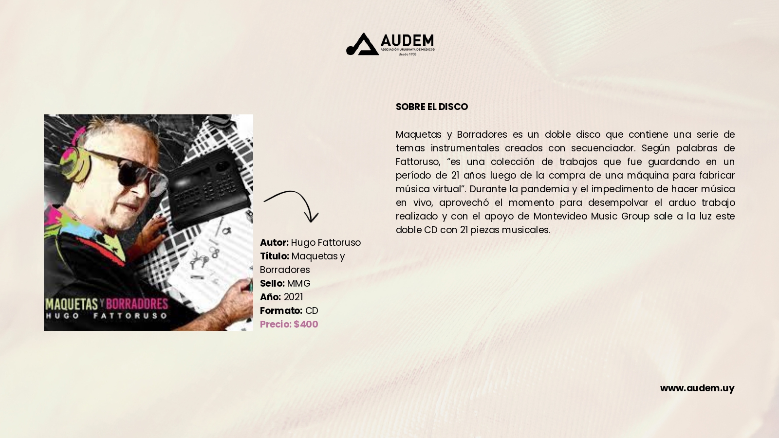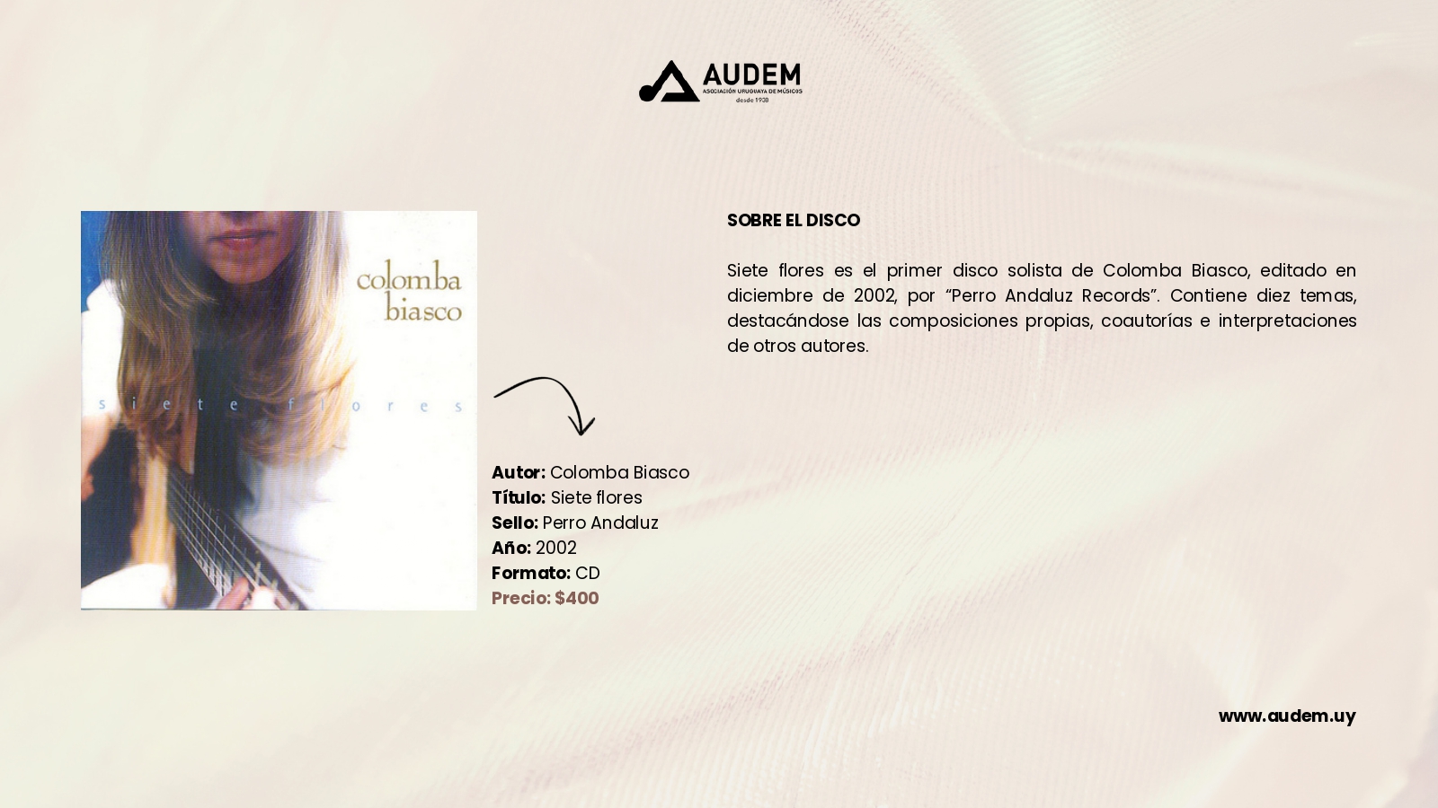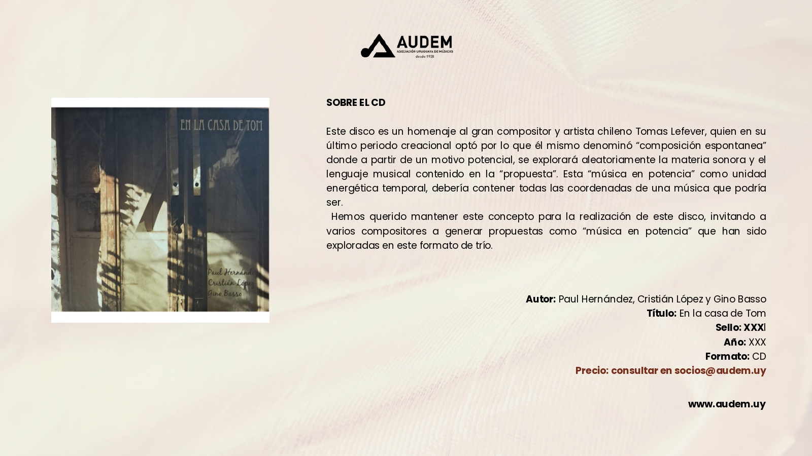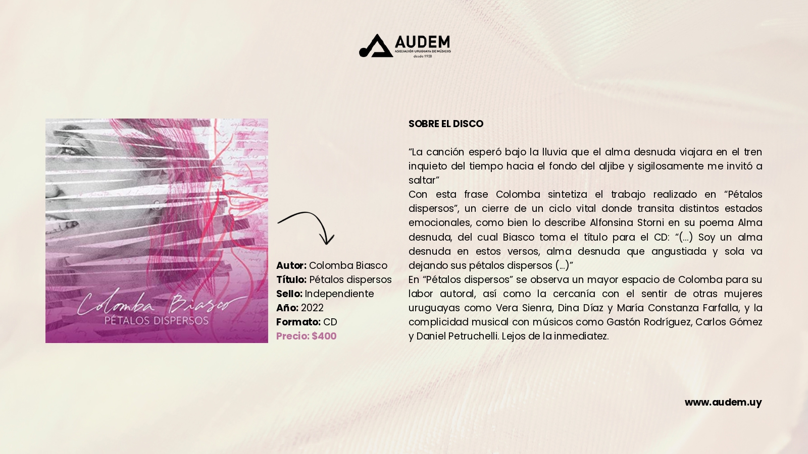 Catálogo Autor de la entrada:cmdadmin Publicación de la entrada:3 de noviembre de 2023 Categoría de la entrada:Catálogo Comentarios de la entrada:Sin comentarios Discos Anterior Siguiente Estos son todos los discos que podrás encontrar en AUDEM Libros Anterior Siguiente Comparte esto Compartir este contenido Se abre en una nueva ventana Se abre en una nueva ventana Se abre en una nueva ventana Deja una respuesta Cancelar la respuestaComentarioIntroduce tu nombre o nombre de usuario para comentar Introduce tu dirección de correo electrónico para comentar Introduce la URL de tu web (opcional) Guarda mi nombre, correo electrónico y web en este navegador para la próxima vez que comente.