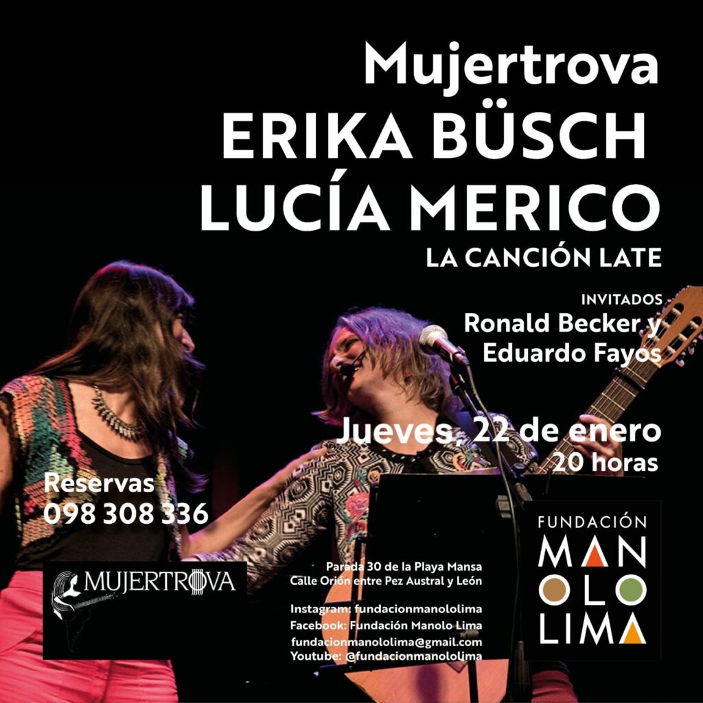 «La canción Late» Erika Büsch y Lucía Merico. Jueves 22 de enero a las 20 hrs en la Fundación Manolo Lima, Casa- Taller del reconocido pintor, ceramista y docente Manolo Lima, discípulo de Torres García, referente y figura de gran incidencia en la cultura de Maldonado.